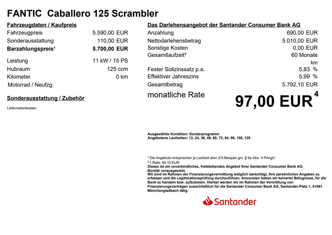 Hier bieten wir Ihnen die wunderschöne Fantic Caballero 125 ABS Scrambler in schwarz Euro 5+ für 2026 mit Ganganzeige für 5590,-€ zuzüglich 110,-€ Liefernebenkosten inkl. einem Finanzierungsangebot in Zusammenarbeit mit der Santander Consumer Bank AG an!