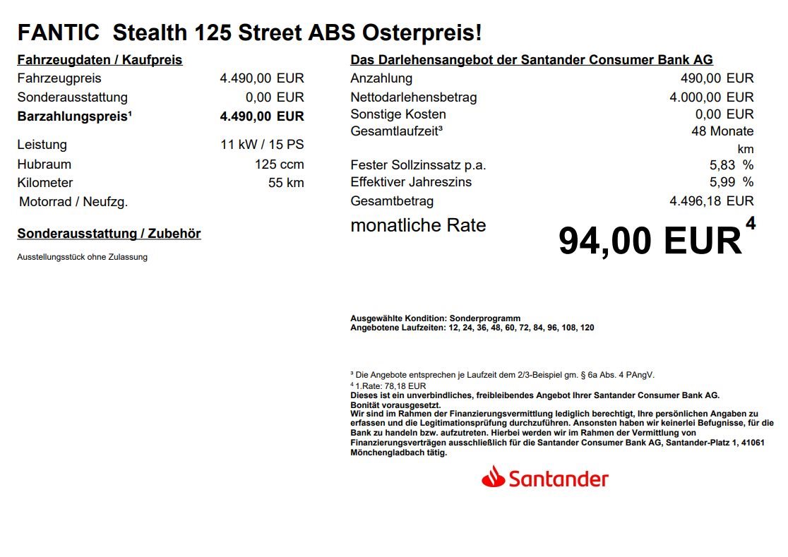 Hier bieten wir die neue wunderbare Fantic Stealth 125 Street , unser Ausstellungsstück mit nur ca 45Km zum Osterpreis an . Diese hübsche Fantic mit dem Arrow Auspuff, dem ABS , der Anti-Hopping-Kupplung , den verstellbaren Brems-/Kupplungshebeln , dem TFT Display und mit ihren 129 Kg ist sie ein Highligth mit Spaßfaktor pur & inkl. einer Finanzierung in Zusammenarbeit mit der Santander Consumer Bank AG !